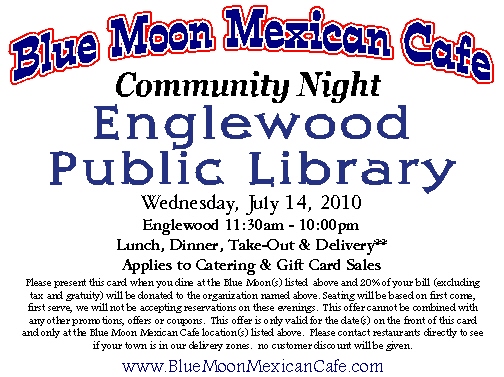 I hope you’re hungry, North Jersey. Today, Wednesday July 14, 2010, Blue Moon Mexican Cafe of Englewood is hosting a fundraiser for the Englewood Public Library. In order for the library to benefit from your excellent taste in restaurants, you must present the following flyer. It’s good for the entire day, and for eat-in, delivery, or carryout orders. Help the library!